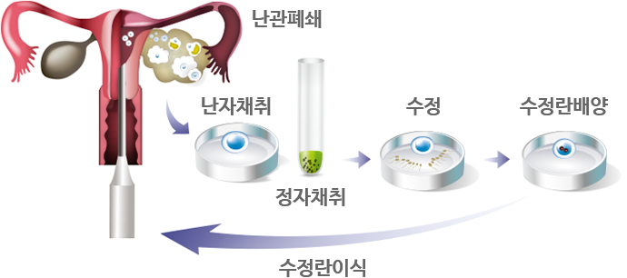 의학적으로 ‘체외수정-배아이식’ (IVF-ET: In Vitro Fertilization-Embryo Transfer)이라고 합니다. 기존에 여성의 난관에서 이루어지는 정자와 난자가 만나는 수정과정 대신에 여성의 성숙 난자와 남성의 정액을 인위적으로 채취해 배양접시에서 수정시킨 후 2~5일 동안 배양시켜 여성의 자궁내막으로 이식해 임신을 유도하는 방법입니다.